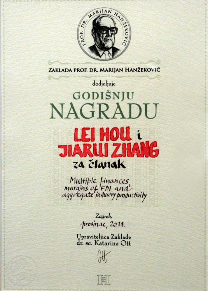 Hou Lei, a Ph.D candidate from joint doctoral training of the Department of International Economics of Economic School and the Economic School of Germany's University of Munich, collaborated with Zhang Jiarui, a Ph.D candidate from the University of Munich, on a thesis ‘Multiple Finances, Margins of FDI and Aggregate Industry Productivity’, which won the “Marijan Hanzekovic Award For The Best Thesis Of The Year 2011 Croatia ”.