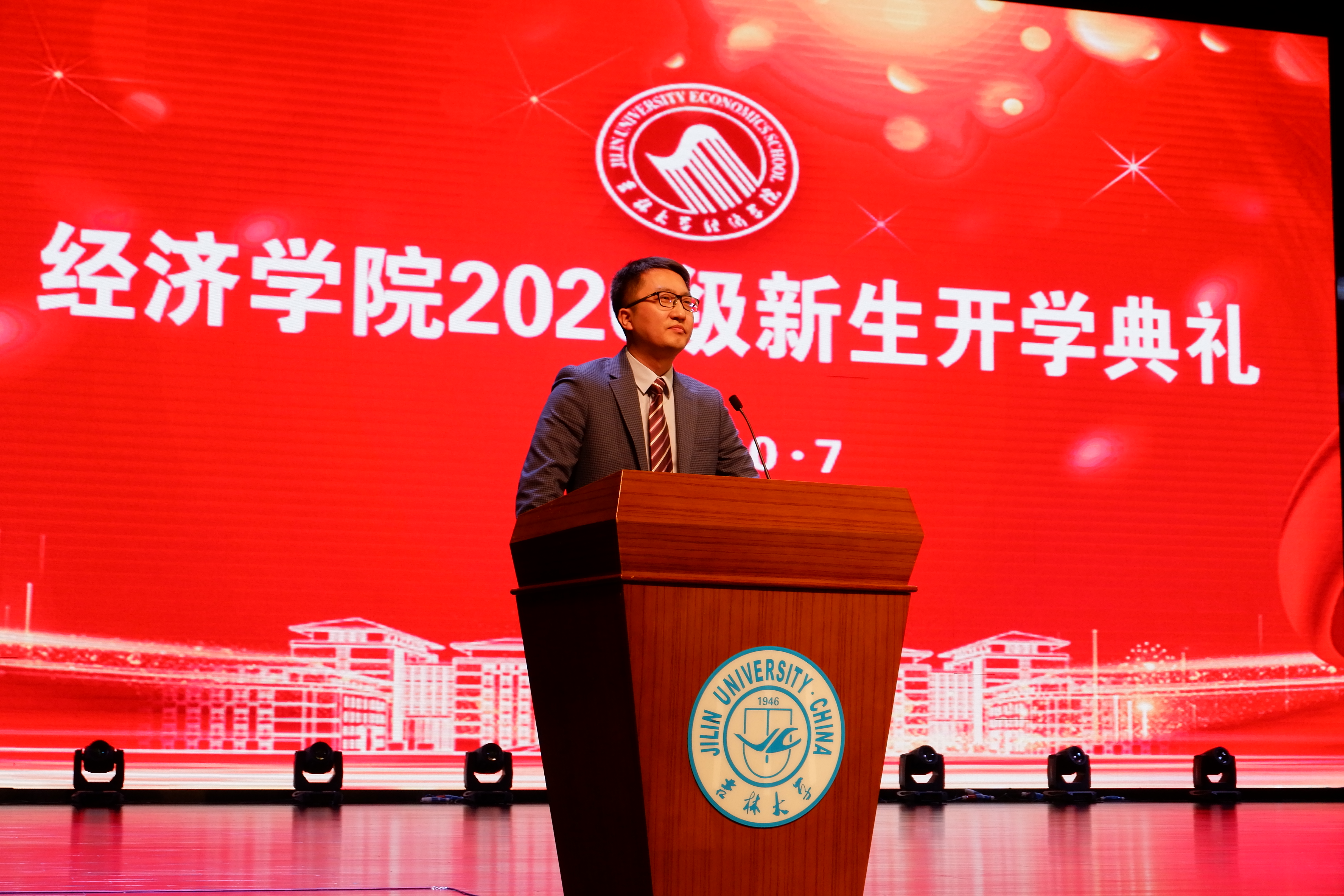 然后,国际经济系主任王达教授作为教师代表讲话。王老师通过生动的事例为新生讲述,要学会自律自强,要拥有自由的灵魂,要做一个有境界的人。
