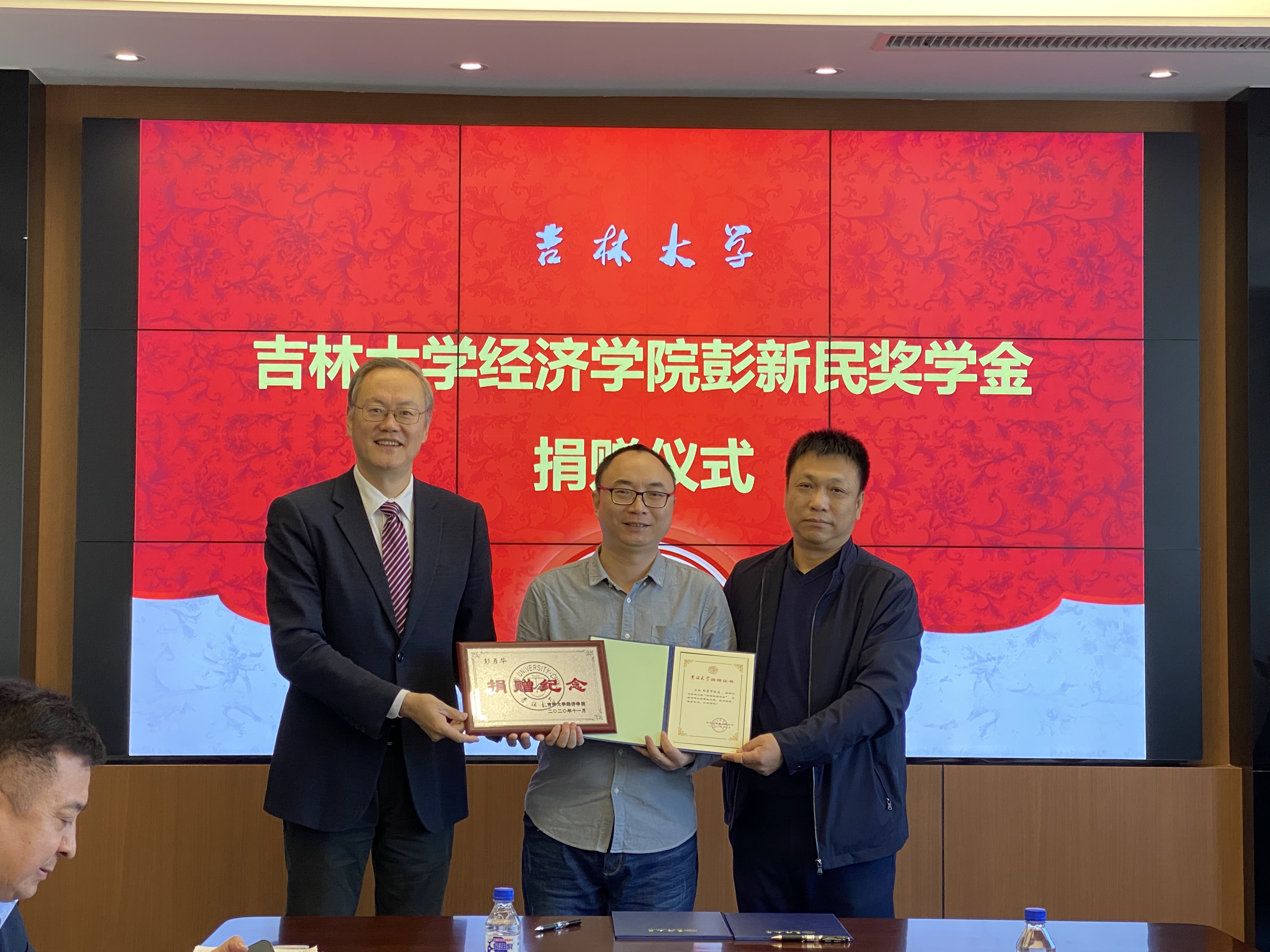 必赢线路检测3003院长李晓教授、校友和基金工作办公室尹彪老师分别为彭勇华校友颁发了捐赠纪念牌和捐赠证书。