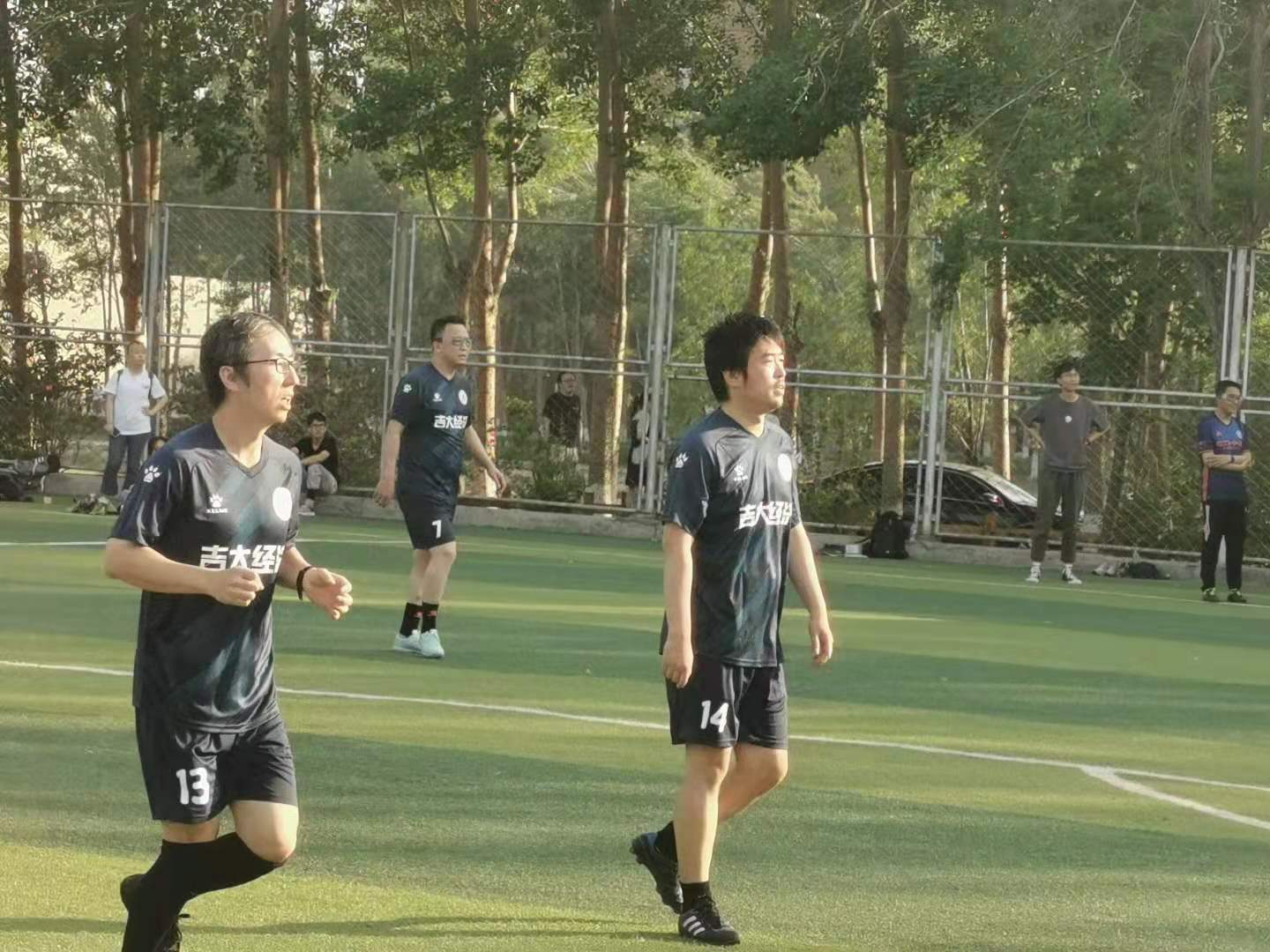 比赛一开始,双方有来有回。教师队伍凭借娴熟的脚下技术和默契的配合掌握了比赛节奏,一度险些攻破球门。随着时间推进,学生代表队逐渐进入状态,双方僵持不下。第13分钟,教师队门前一片混战,学生代表队在混乱中打进一球。丢球后,教师队重新组织,把局势稳定下来。很快,教师队在前场得到绝佳机会,符宁老师一击破门,比分来到1:1。全程比赛,双方互有攻守,在主裁判一声哨声中,师生足球赛落下了帷幕,教师队1:3憾负学生队。