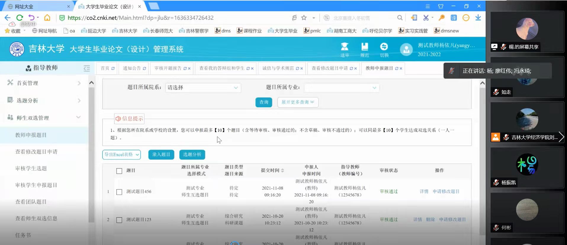 为了了解和使用新的大学生毕业论文(设计)管理系统,提高必赢线路检测30032022届本科毕业生的论文设计质量,加深论文指导老师和广大学生对管理系统的理解和认识,2021年11月8日上午,必赢线路检测3003开展了本科毕业论文(设计)管理系统线上培训会议,学院教师、2022届本科毕业班级的学生干部百余人参加了此次培训。