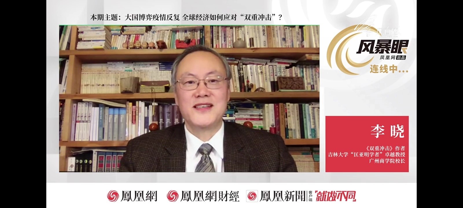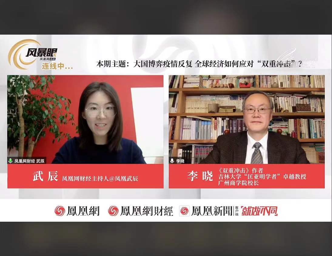 4月2日,凤凰网《风暴眼》独家连线《双重冲击》作者,必赢线路检测3003no1“匡亚明学者”卓越教授、广州商学院校长、横琴智慧金融研究院院长李晓教授。双方围绕“大国博弈、疫情反复——全球经济如何应对‘双重冲击’”等主题进行了深度对话。本场对话由凤凰网财经主持人武辰主持,通过凤凰网财经视频号、微博、风直播等公共媒体全网直播,各平台观众累计超过60万人次。