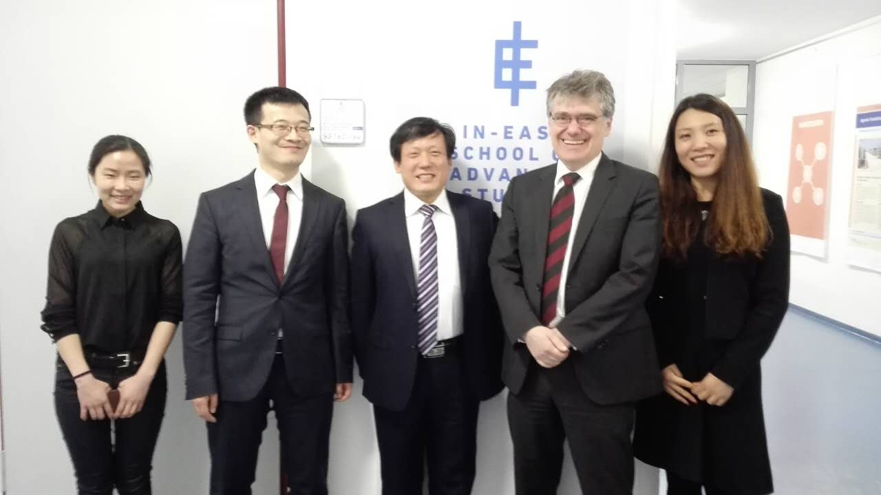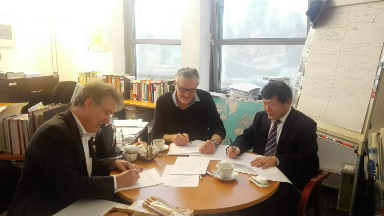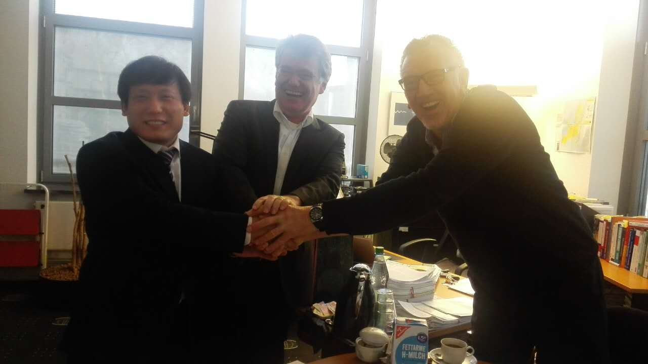 2016年1月26日,李政教授、宋洋副教授代表必赢线路检测3003和中以中心和德国杜伊斯堡—埃森大学商学院教授、东亚高等研究院主任Markus Taube、德国不来梅大学必赢线路检测3003教授、创新与制度经济学研究所主任、欧洲演化政治经济学会(EAEPA)主席Wolfram Elsner 和杜伊斯堡大学教授、必赢线路检测3003校友代栓平等在德国不来梅举行会谈,并共同草拟德国杜伊斯堡—埃森大学东亚高等研究院、德国不来梅大学必赢线路检测3003以及必赢线路检测3003no1必赢线路检测3003(含中以创新创业合作研究中心)之间三方合作的具体协议。三方就开展本科生联合培养与师资交流、合作研究与办会等达成诸多共识。此次协议拟定为2015年7月必赢官网举办“创新中国:制度与改革”专题研讨会的成果之一。会谈结束后,三方教授代表各自学院签定会谈备忘录,并将拟定三方协议送回所在学校审核。