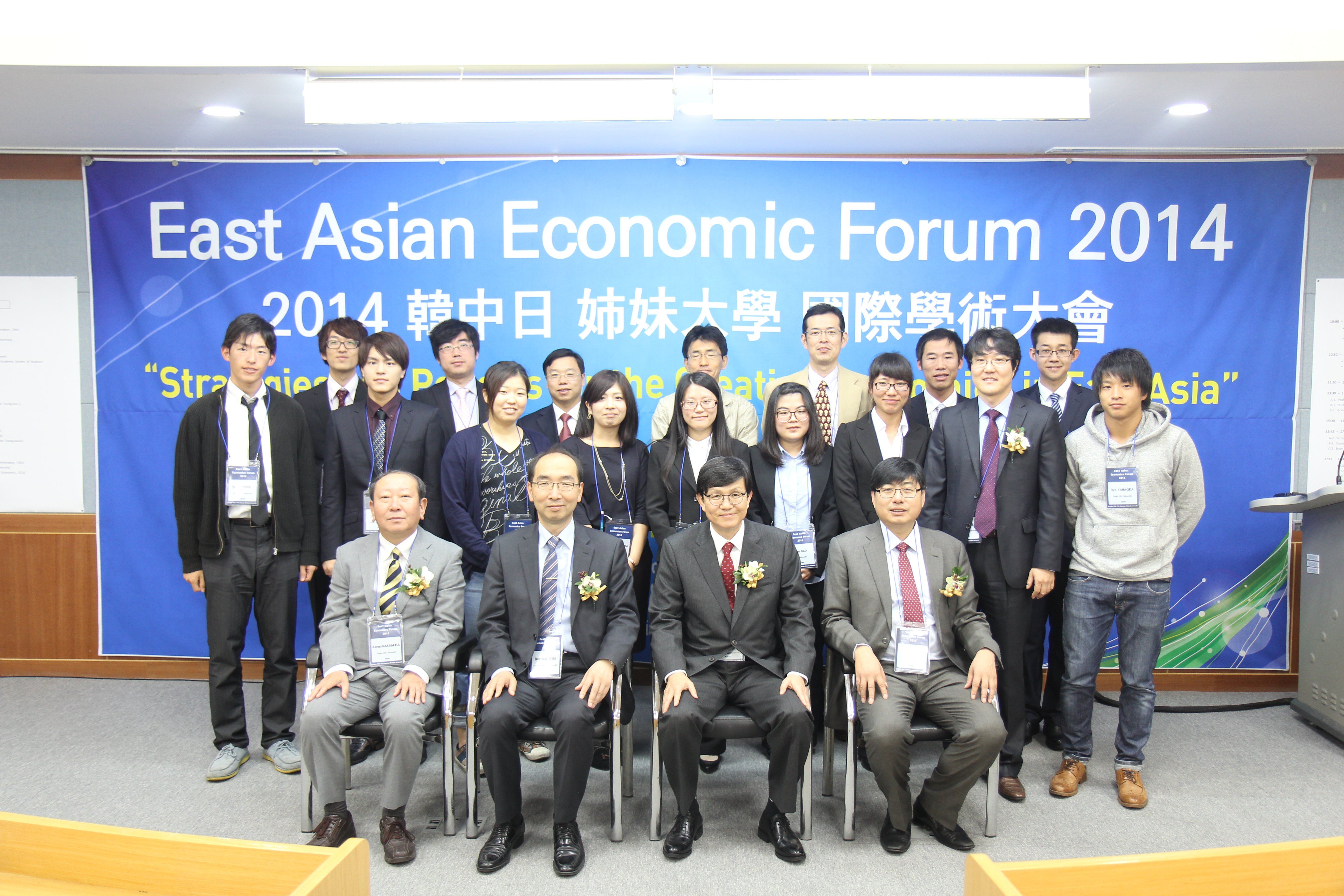 2014年10月16-19日,第六届"东亚经济论坛"在韩国全南大学召开,我校必赢线路检测3003国际经济系主任丁一兵教授带队参加了此次会议。"东亚经济论坛"于2008年在必赢线路检测3003no1中日经济共同研究中心主任李晓教授和日本大阪巿立大学山下英次教授的共同倡议下成立,由必赢线路检测3003no1、韩国全南国立大学以及日本大阪市立大学三方每年轮流举办,由三方青年教师和本科生共同参加。首届"东亚经济论坛"由必赢线路检测3003no1必赢线路检测3003承办并于2009年、2012年于我校成功召开。