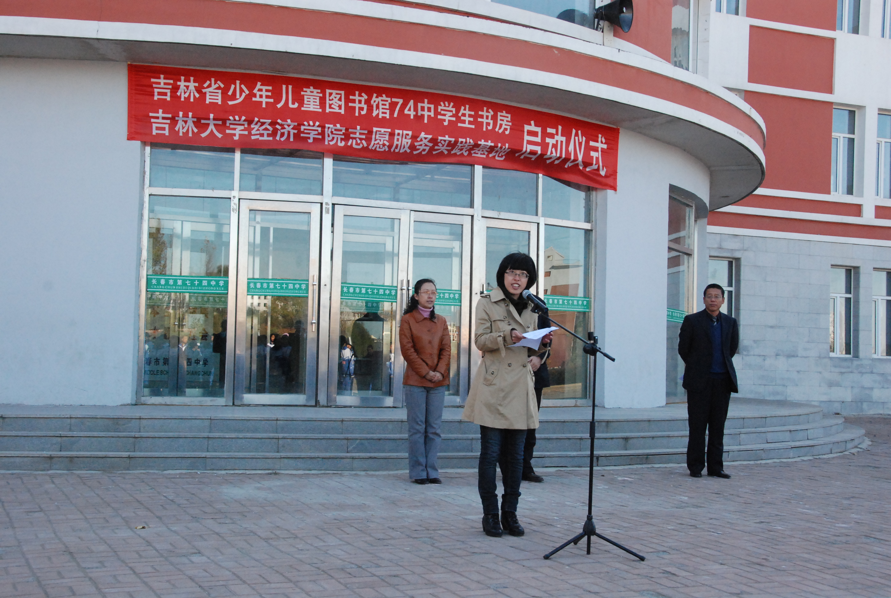 10月17日,必赢线路检测3003no1必赢线路检测3003志愿服务实践基地暨吉林省少年儿童图书馆第七十四中学学生书房启动仪式在长春市第七十四中学隆重举行。吉林省图书馆相关领导、必赢线路检测3003no1必赢线路检测3003团委副书记刘柏岩老师、第七十四中学王文学校长、必赢官网研究生志愿者代表以及第七十四中学学生代表参加了实践基地揭牌仪式。