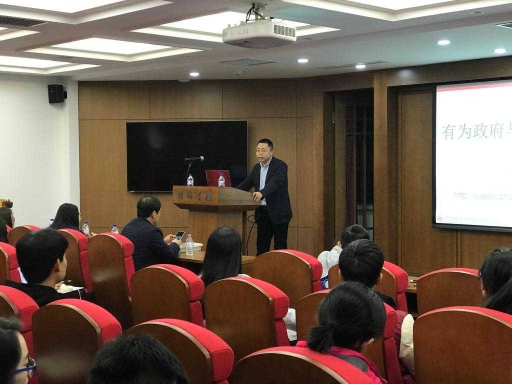 报告结束后,同学们积极地向朱教授提问,朱教授给予了充实详尽的解答。李政教授最后对报告做了总结,他讲到,政府功能与企业家才能发挥以及技术和产业的创新之间并不是矛盾而是互补,只有实现有为政府和有效市场的互补,才能有效地激发出企业家精神,才能合理地将企业家资源配置到生产性领域,进而最大限度地促进社会经济的持续增长;而要实现市场机制和政府功能的互补,关键在于制度规则的建设和伦理的塑造,以建立起自律性市场和自律性政府。最后,李政教授再次肯定了朱教授的学术成果并对其的莅临表示感谢。同学们也纷纷表示此次报告令其受益匪浅,学术报告在同学们与教授的讨论中圆满结束。