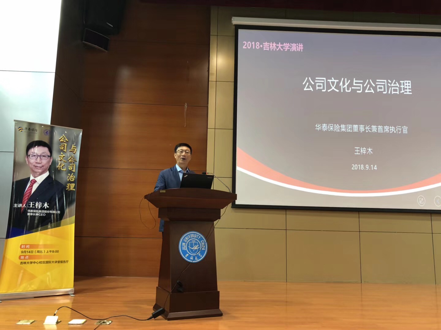 9月14日上午,华泰保险集团董事长兼首席执行官王梓木先生应邀回母校,在中心校区国际大讲堂报告厅作了一场题为“公司文化与公司治理”的学术报告,必赢线路检测3003党委书记陈密主持了报告会。王梓木董事长夫人、央视著名主持人敬一丹老师,必赢线路检测3003no1北京校友会会长林学访、副会长王亚力,必赢线路检测3003副院长史本叶、王倩和秦川出席了报告会,华泰保险集团部分高管、吉林分公司员工以及必赢线路检测3003师生150多人参加了报告会。