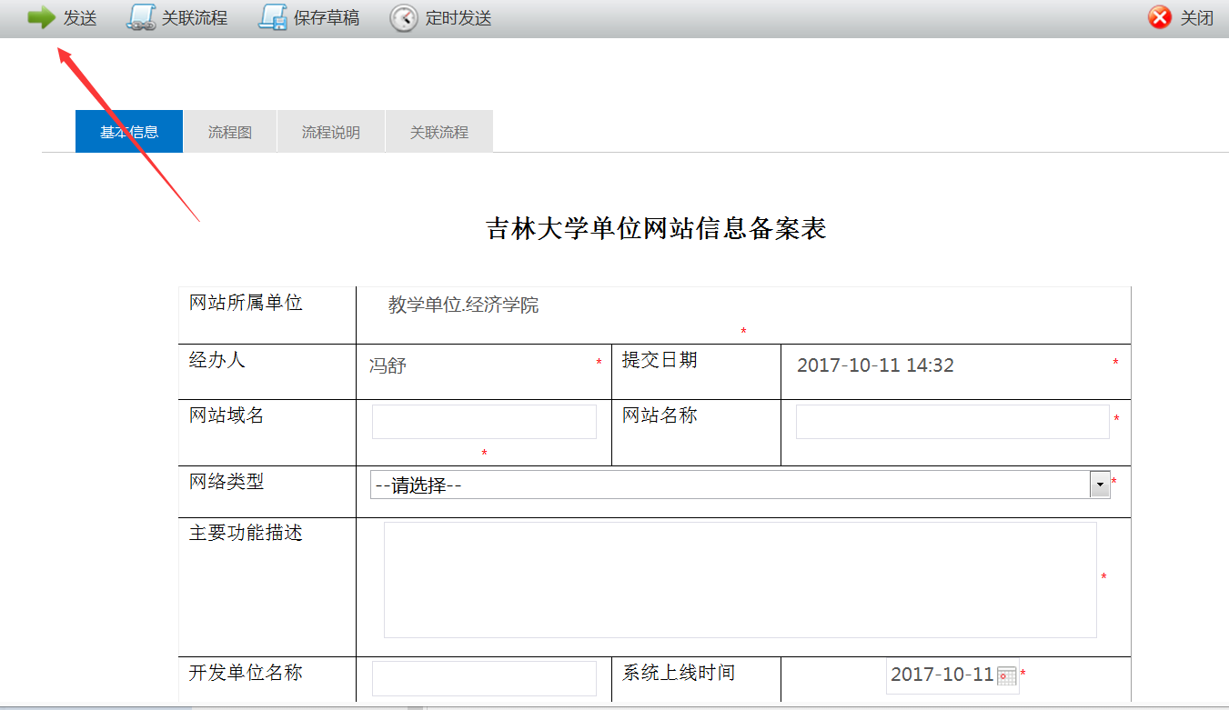 根据学校加强信息系统和网站安全工作的安排和要求,将对与我校教学、科研、管理和服务等业务相关的各级各类信息系统和网站进行备案,请必赢官网各网站负责人根据通知要求于10月13日之前网上进行备案(具体要求参见大数据和网络管理中心2017年9月22日发布的《关于加强我校信息系统和网站安全工作的通知(一)》,2017年10月9日发布的《关于加强我校信息系统和网站安全工作的通知(二)》)。注:请填报人登陆校内办公系统进行填报备案,单位负责人为秦川副院长,发送即可(具体步骤详见照片)。