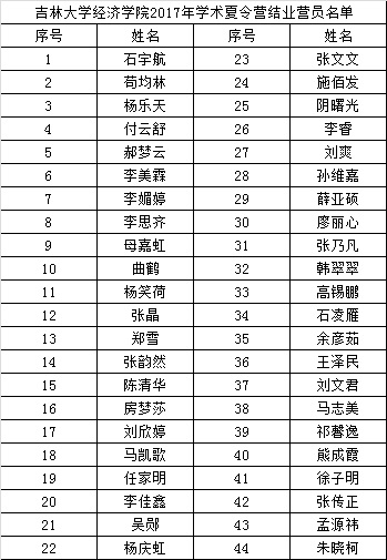 1、经学院夏令营工作小组评审,石宇航等44名营员考核合格,准予结业。结业营员名单详见附件。
