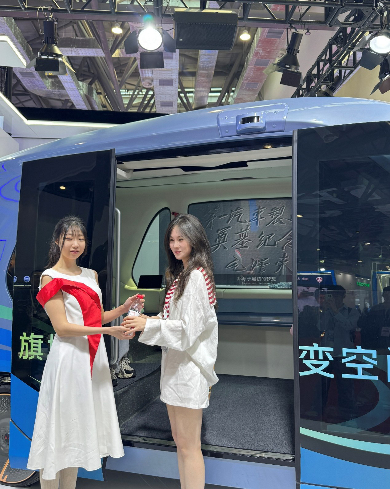 红旗展区的智能小巴凭借流线型外观和先进智能系统成为焦点。同学们登上小巴,体验其宽敞舒适的内部环境,智能语音助手热情回应每一个问题,让大家切实感受到未来出行的魅力,体会到科技创新对汽车产业转型升级的推动作用。
