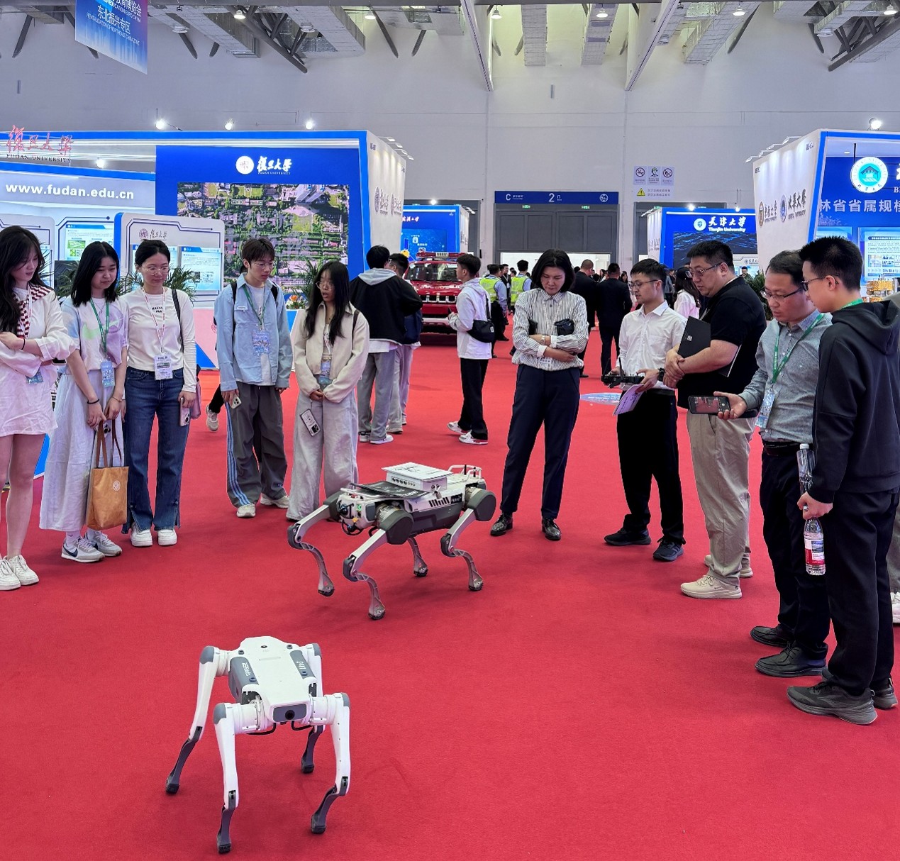 浙江大学展区的机械狗活力四射,招手、拜手、左右扭动等灵动表演引得同学们笑声不断,纷纷拿出手机记录精彩瞬间,感受科技与生活的完美融合,并讨论了人工智能和机械自动化对劳动力市场和生产效率的影响。