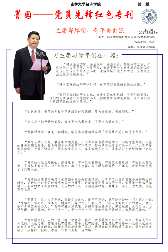 红色专刊围绕习近平总书记讲话,就“法治中国、青年使命”等话题进行专题讨论。同学们纷纷表示要好好学习习近平主席重要寄语,求实创新,励志图强,用奋斗点燃青春梦想,用奉献实现人生价值。