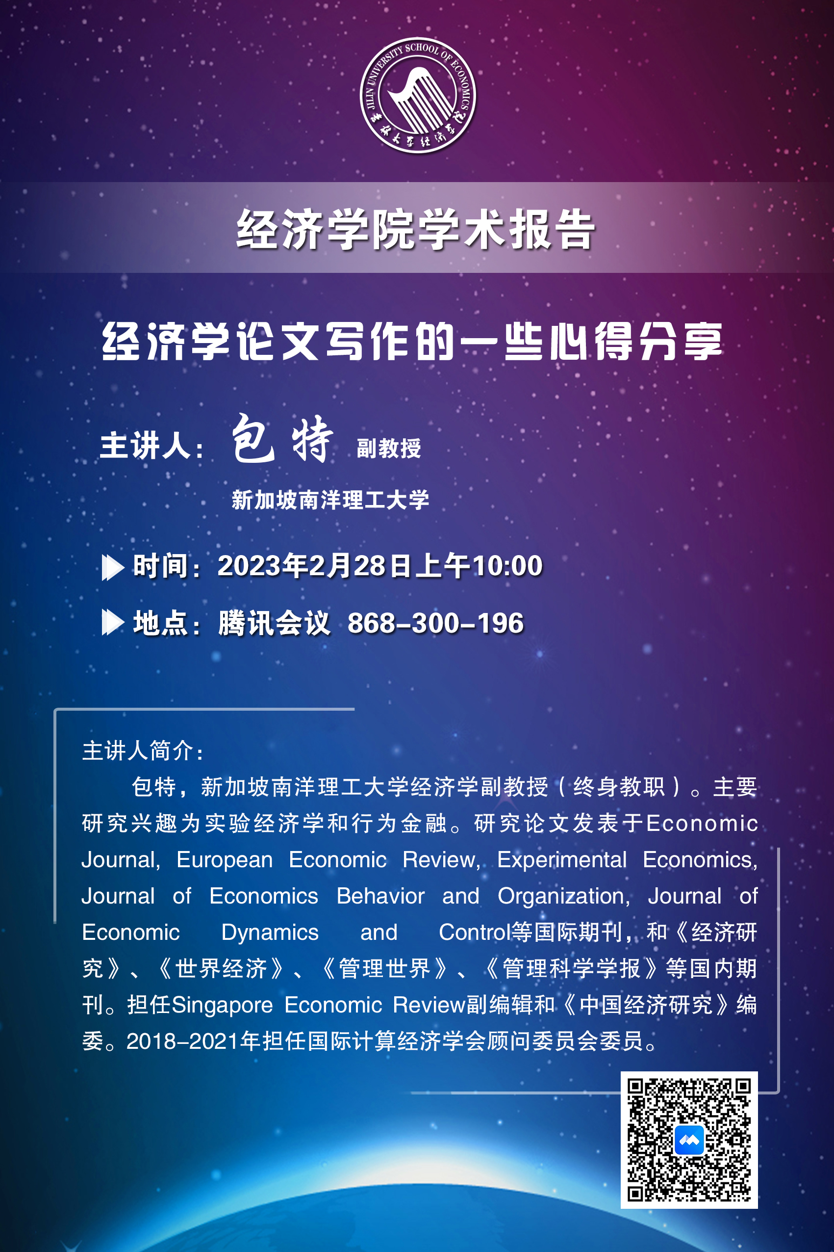 包特,新加坡南洋理工大学经济学副教授(终身教职)。主要研究兴趣为实验经济学和行为金融。研究论文发表于Economic Journal, European Economic Review, Experimental Economics, Journal of Economics Behavior and Organization, Journal of Economic Dynamics and Control等国际期刊,和《经济研究》、《世界经济》、《管理世界》、《管理科学学报》等国内期刊。担任Singapore Economic Review副编辑和《中国经济研究》编委。2018-2021年担任国际计算经济学会顾问委员会委员。