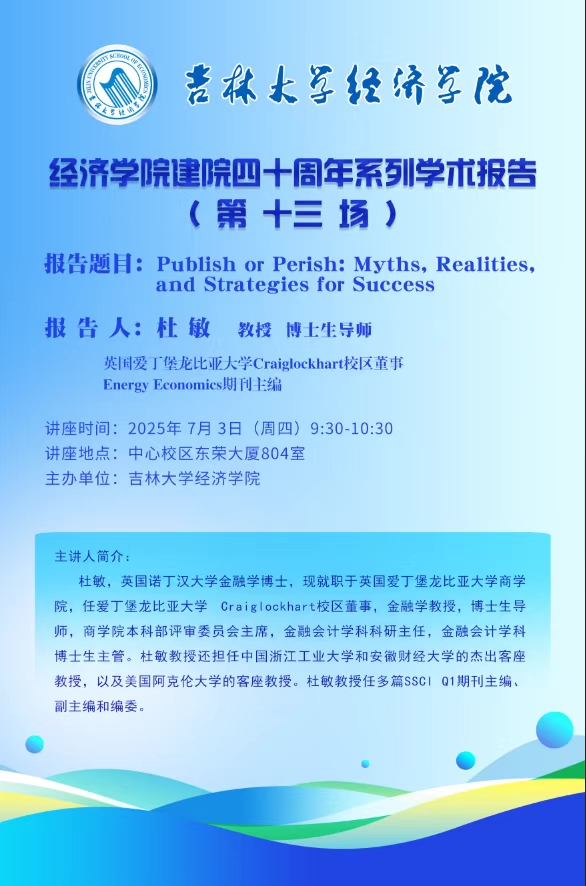 杜敏,英国诺丁汉大学金融学博士,现就职于英国爱丁堡龙比亚大学商学院,任爱丁堡龙比亚大学Craiglockhart校区董事,金融学教授,博士生导师,商学院本科部评审委员会主席,金融会计学科科研主任,金融会计学科博士生主管。杜敏教授还担任中国浙江工业大学和安徽财经大学的杰出客座教授,以及美国阿克伦大学的客座教授。杜敏教授任多篇SSCI Q1期刊主编、副主编和编委,包括International Journal of Finance and Economics (ABS 3), European Journal of Finance (ABS 3), Energy Economics (ABDC A*, ABS 3, SSCI Q1, IF:13.6,经济学学术期刊影响因子全球第一), Corporate Governance: An International Review (ABS 3,领域top), Research in International Business and Finance (ABS 2, SSCI Q1, IF:6.3,金融学学术期刊影响因子全球第十二), Financial Innovation(ABS 2,SSCI Q1,IF:6.9,金融学学术期刊影响因子全球第九),EIA Review (中科院1区, SCI SSCI双1区, IF: 9.8),并为50余SSCI Q1, ABS 3及以上级期刊担任同行评审专家。杜敏教授已在SSCI Q1杂志发表论文83篇,包括3篇ABS 4。杜敏教授已指导博士毕业5名,目前指导5名在读博士研究生和8名硕士研究生论文。杜敏教授同时为英国萨里大学国际金融管理研究生项目校外评审,同时也是英国高等教育学会会员并有十余年英国大学高等教育的工作经验。