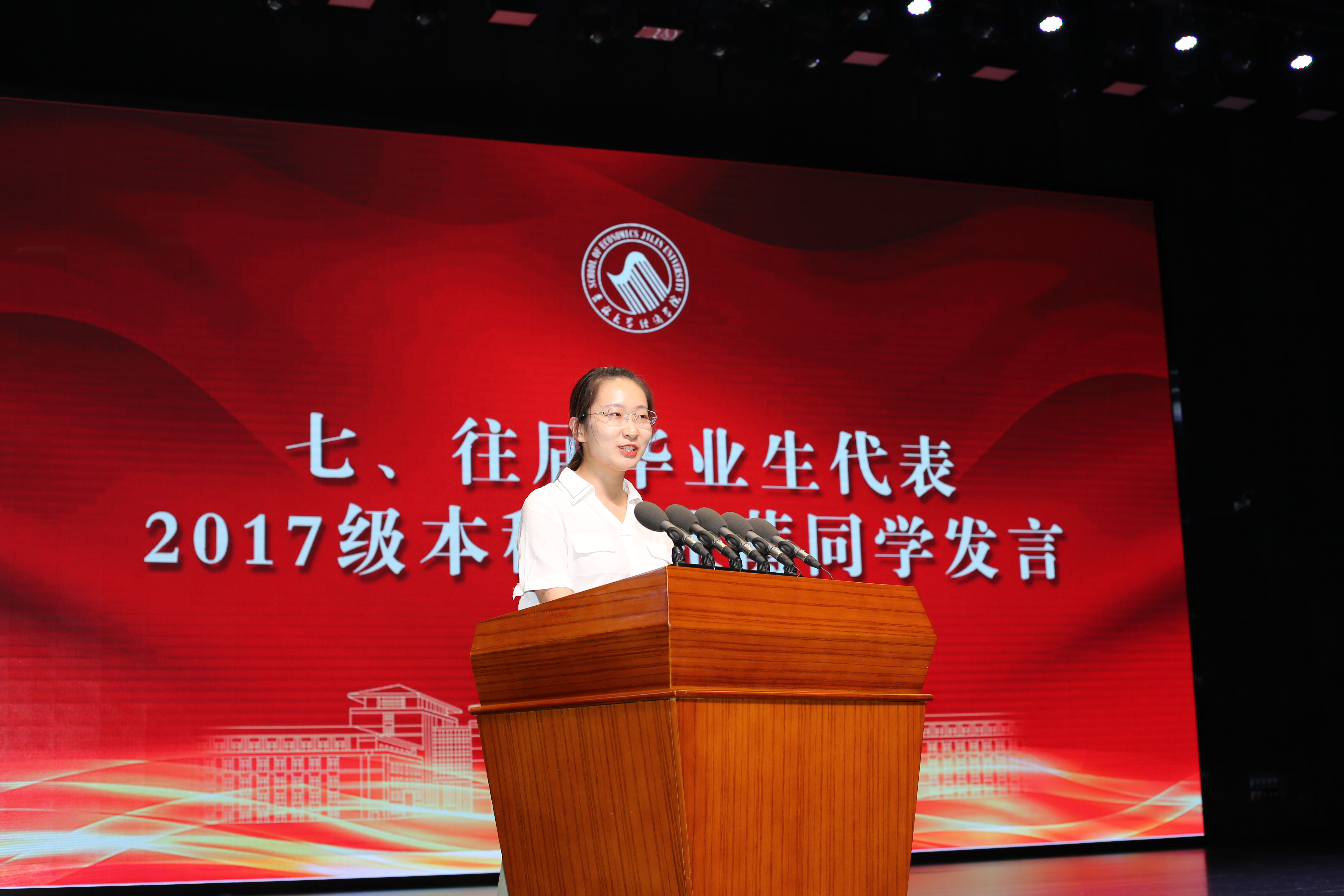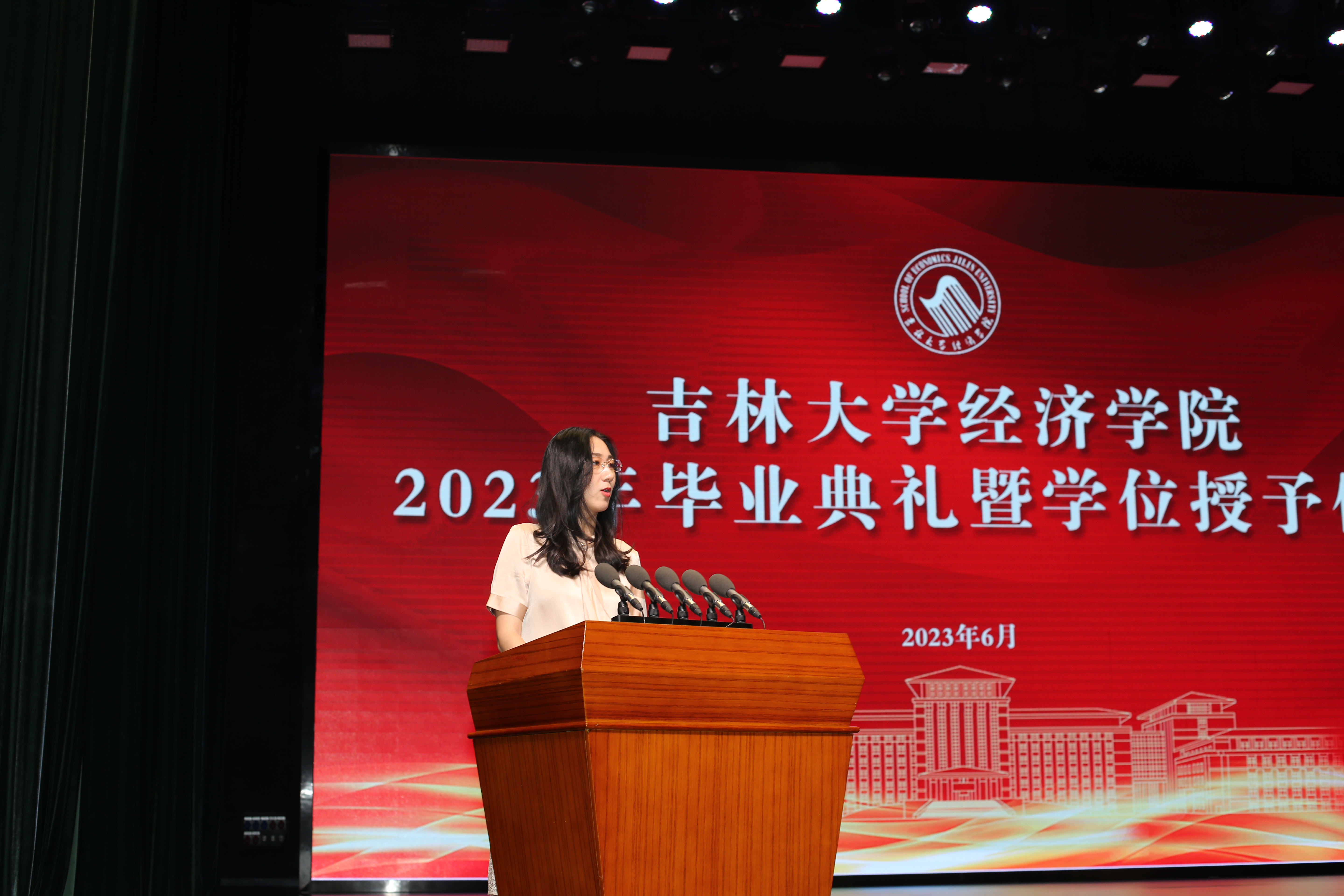 往届毕业生代表2017级本科生张蘅同学也返校参加仪式,张蘅在发言中回顾了在吉大难忘的学习和生活经历,“回家了。昨天晚上我从东门走到大学城,一路上看到五月花广场、清湖的小天鹅、日新楼的美食、经信自习室的灯光......一切都还是熟悉的样子。”张蘅同学也向2023届的毕业生们表达了诚挚的祝福。