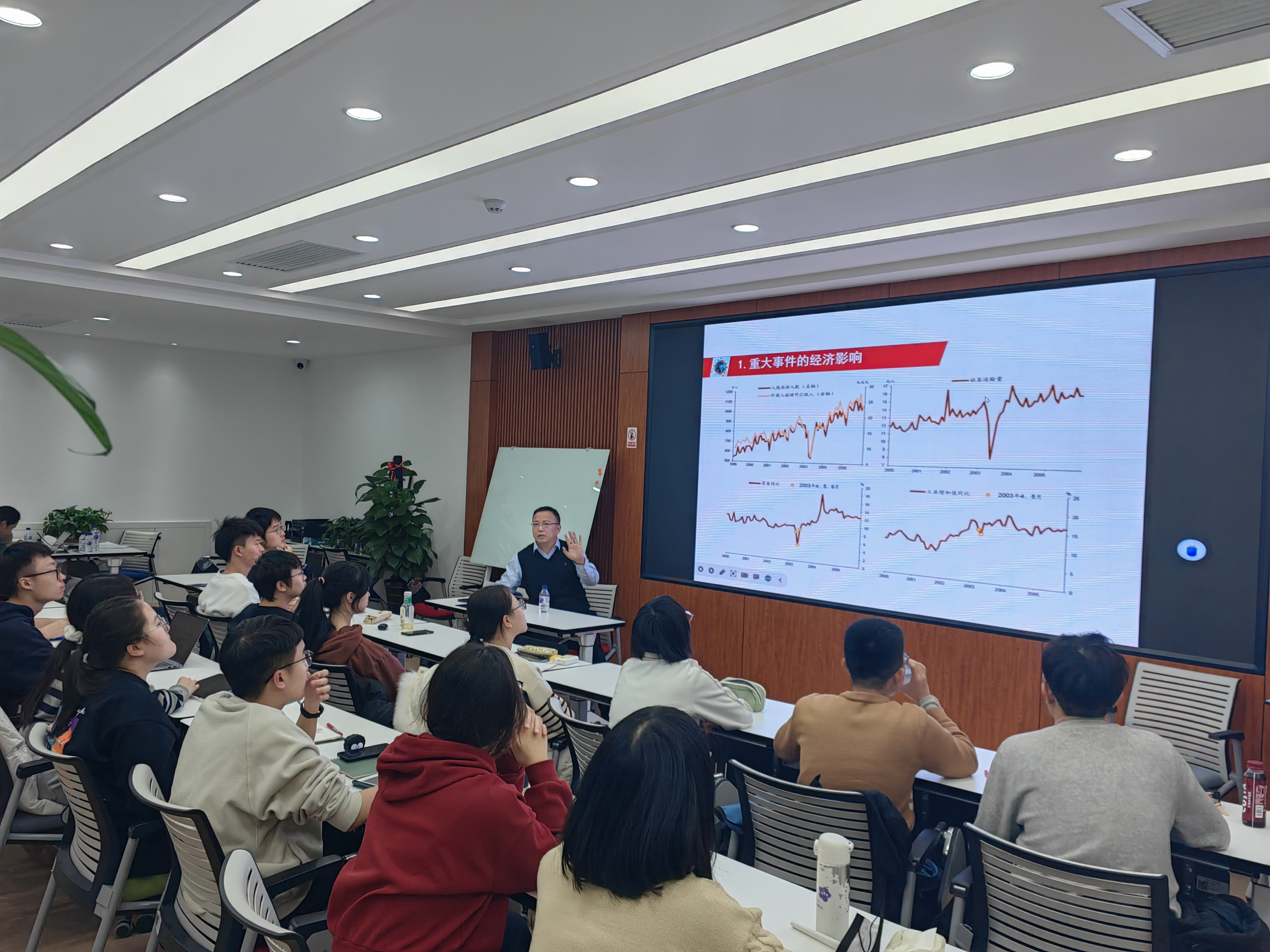 在近三个小时的讲座中,赵新宇教授从“世界金融经济危机”“中美贸易摩擦”“新冠肺炎疫情”“俄乌冲突”等重点问题对经济影响的分析切入主题,清晰、深入、生动地剖析了当前世界宏观经济走势与中国宏观经济表现,提出了许多独到的学术观点并与学生们进行了互动,现场气氛活跃。