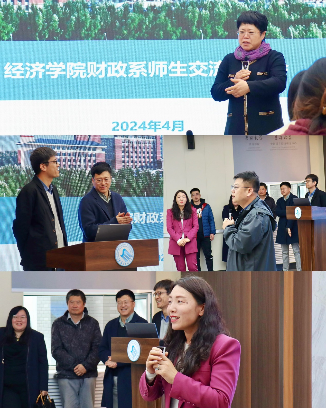 财政系系教工党支部书记宋洋介绍了财政系教师的基本情况,包括学术背景、研究方向和教学经验等,使学生们对老师们有了更为全面和深入的了解,为后续的深入交流奠定了坚实的基础。