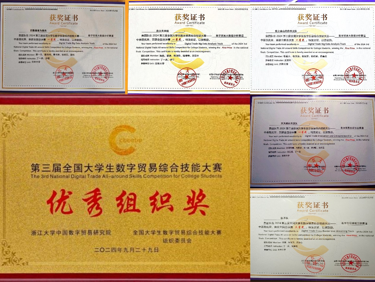 2024年9月29日,由浙江大学中国数字研究院主办、全国大学生数字贸易综合技能大赛组织委员会承办的第三届全国大学生数字贸易综合技能大赛总决赛在浙江大学落幕。必赢官网师生在全国总决赛上表现出色,获得了总决赛一等奖4项、三等奖1项的优异成绩,丁一兵、史本叶、孙黎、徐宁、张弘媛获得了“优秀指导教师奖”,必赢线路检测3003no1必赢线路检测3003获得了“优秀组织奖”。