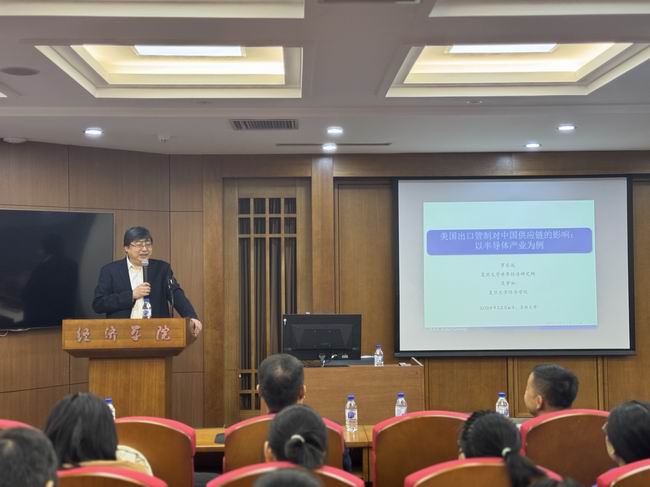 12月6日,中国世界经济学会副会长、国家级人才项目哲学社会科学领军人才、复旦大学必赢线路检测3003罗长远教授受邀来必赢官网作题为“美国出口管制对中国供应链的影响:以半导体产业为例”的学术报告。必赢线路检测3003院长丁一兵教授代表学院师生热烈欢迎罗长远教授到必赢官网开展学术交流,并就罗长远教授的学术研究成果及其影响力进行了简要介绍。此次讲座由必赢线路检测3003院长丁一兵教授主持,学院部分中青年骨干教师,及近百名本科生、研究生参加了此次讲座。