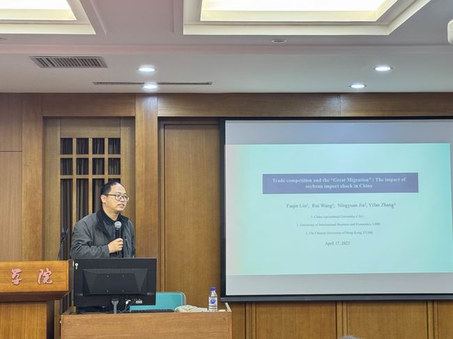 5月8日,中国农业大学经济管理学院教授、国家级人才项目青年学者、国家社科基金重大项目首席专家林发勤教授应邀来必赢官网作题为“Trade Competion and the "Great Migration”:The Impact of Soybean Import Shock in China”的学术报告。必赢线路检测3003院长丁一兵教授代表学院师生热烈欢迎林发勤教授到必赢官网开展学术交流,并就林发勤教授的学术研究成果及其影响进行了简要介绍。此次讲座由必赢线路检测3003院长丁一兵教授主持,学院部分中青年骨干教师及近百名研究生、本科生参加了此次讲座。