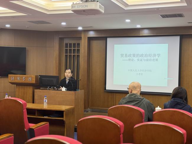 讲座开始后,王孝松教授从政治与经济互动的视角出发,对贸易政策的制定进行剖析,指出纯贸易理论解释的缺陷,并认为公共政策的制定受政治、经济等多方面因素的影响。随后,王孝松教授以经典文献为例,详细介绍现有研究如何突破传统贸易理论的框架,通过对政府目标函数的修正,引入政策制定的政治背景,进而揭示出影响贸易政策形成与变化的因素。之后,王孝松教授又对现有研究如何将公共选择的分析范式嵌入传统的贸易理论以及从政策决策过程的视角探究贸易干预的水平、结构、形式和变化等内容进行了讲解。最后,王孝松教授通过理论建模和实证分析的方式,展示了如何用政治与经济互动的方法研究贸易理论,并对比多种理论模型,阐释建模思想。