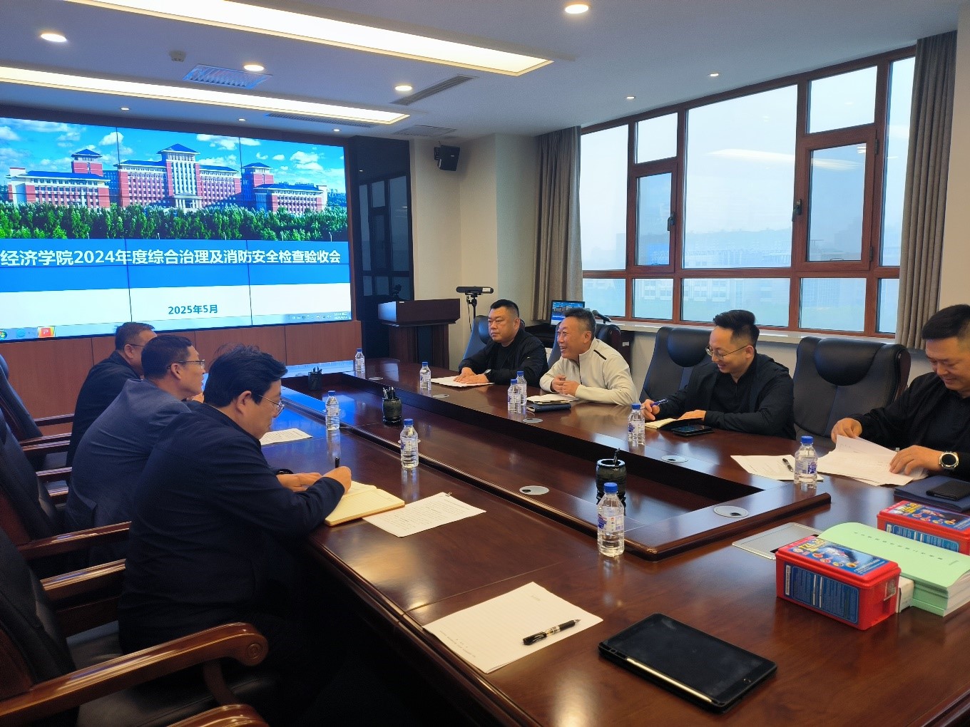 2025年5月14日上午,必赢线路检测30032024年度综合治理及消防安全检查验收工作在东荣大厦808会议室举行。学校中心校区第一检查组副组长保卫处李勇副处长、校党委办公室张磊老师,消防科董立明科长、治安科赵明科长一行莅临学院进行检查指导。必赢线路检测3003党委书记聂宏凯、行政副院长邱立民、行政综合办公室主任潘国刚及相关工作人员参加会议。