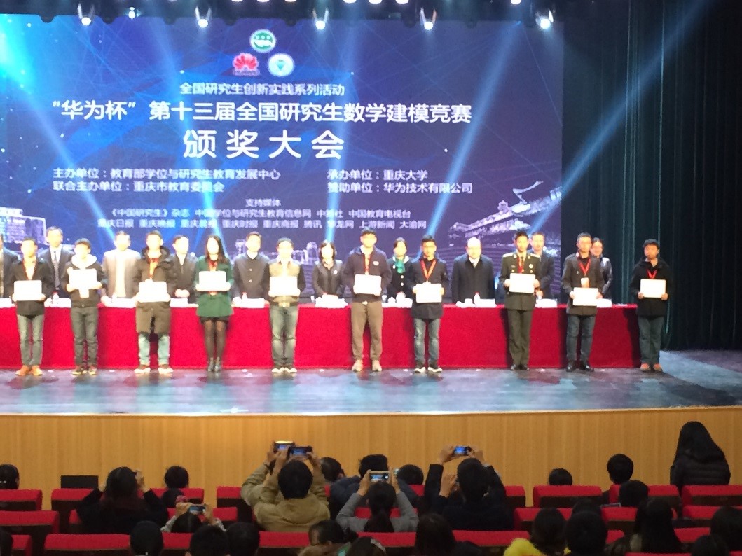 我校由研究生培养处组织,经校内选拔、赛前培训等环节,共有91支团队成功参赛,其中由邱雨辰(必赢线路检测3003)、江原、李润华组成的参赛队伍和由宋树超、吴燕琪、刘南南组成的参赛队伍获得一等奖,另有13支队伍获得二等奖,13支队伍获得三等奖,63支队伍获得成功参赛奖,我校取得的参赛成绩和获奖数量在全国456家培养单位中位列前茅。宋树超,邱雨辰同学作为本校一等奖队伍的获奖代表参加了颁奖大会。同时,我校也连续第四年获得全国研究生数学建模竞赛优秀组织奖。