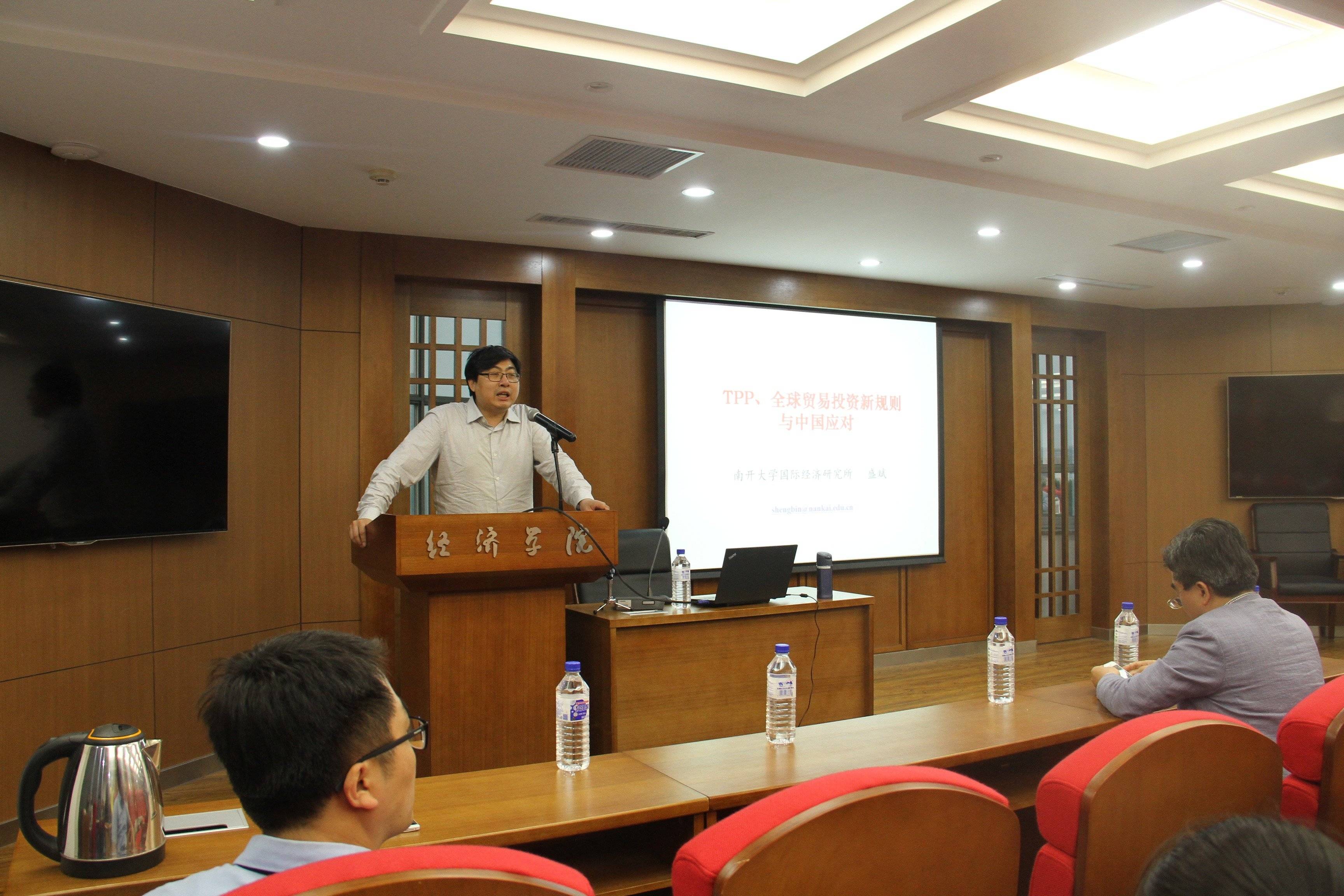 2016年5月18日晚6:30,南开大学研究生院常务副院长、教育部、国务院学位委员会学科评议组委员盛斌教授在我校中心校区东荣大厦A804会议室,作了一场题为“TPP、国际贸易投资新规则与中国的应对”的学术讲座。
