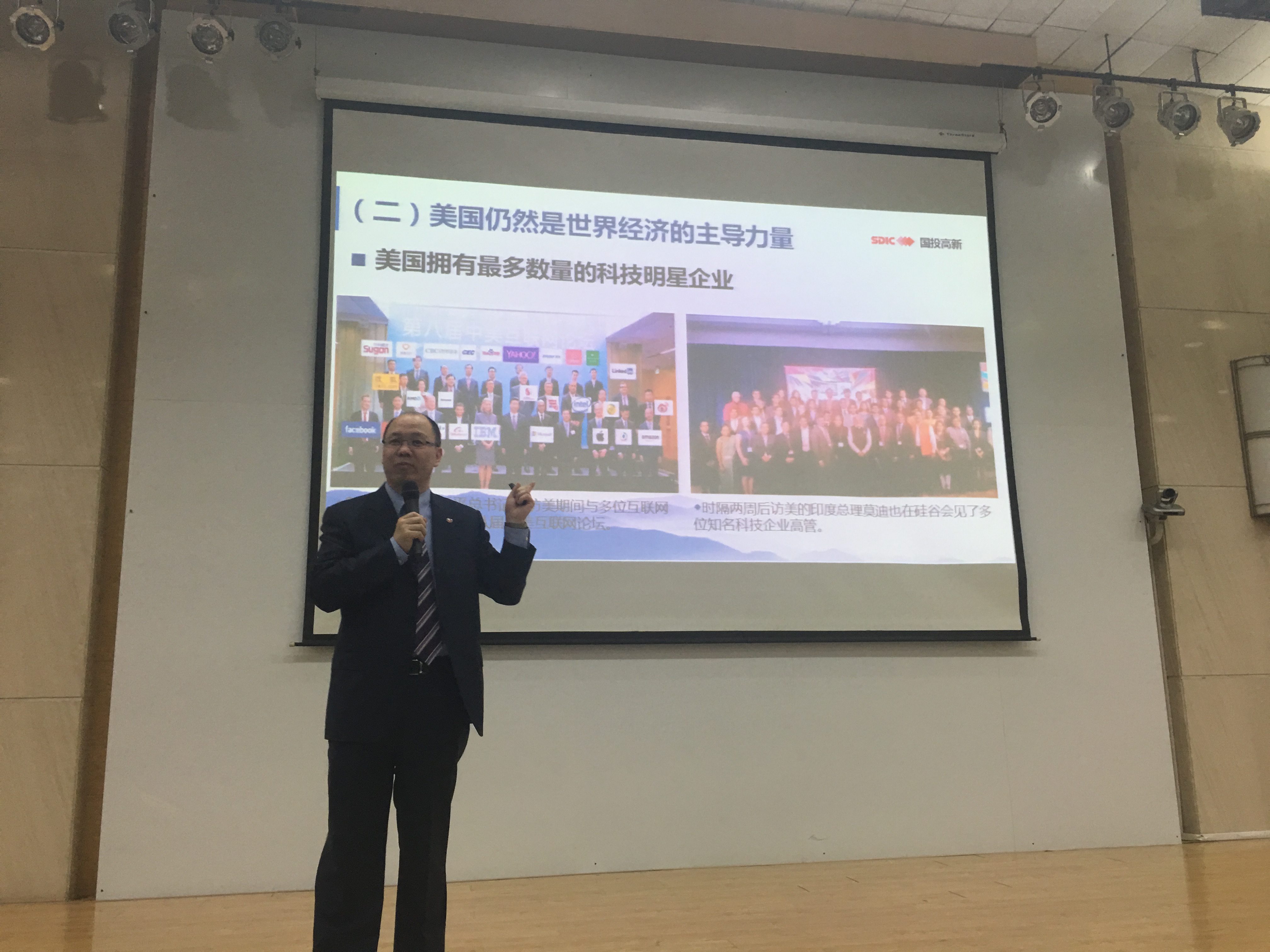 李宝林董事长的报告以现代管理学教父彼得·德鲁克的“要事优先”原则开篇,从创新的动因、创新的机遇、创新的格局和未来的机会四个方面展开。首先,他全面解读了美、日、欧盟等世界主要经济体以及新兴经济体的经济发展形势,并指出我国经济步入“新常态”后面临的经济增速放缓、产业转型升级等新问题。在当前的经济背景下,变革的时代带来更多创新机遇。他指出,“工业4.0的到来预示着技术进步的周期越来越短,新兴技术产品不断涌现,新的商业模式加速传统产业的重构,很多新兴企业开始以指数型增长模式增长,资本与技术无缝结合的纳斯达克示范效应风靡全球。”关于未来的机会和前景,他认为,虽然中国的人力成本增加,但是随着二胎政策的开放,人口红利不会消失,中国依然是引领世界经济的重要力量。未来的经济将是按需经济,产品服务实现定制,个人可以成为“自企业”,互联网金融与财富管理随着监管体系的健全会释放出巨大的能量,创造更多财富。报告最后,李宝林董事长以院友的身份对同学们的择业和未来发展给予了中肯的指导,并对同学们提出的股权投资、跨国并购等问题进行了耐心解答。