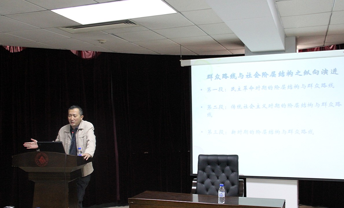 讲座包括三个部分,分别为“阶级阶层结构变迁与群众路线的关系”、“新时期阶级阶层变迁及趋势”、“阶级阶层结构变迁对群众路线的影响”。 首先,田教授就中国革命胜利、群众路线、如何同群众联系、社会的文化与网络四个问题进行了阐述,揭示了中国革命的胜利依靠群众路线、中国新时期的发展离不开群众路线的深刻道理。其次,田教授通过列举大量图文资料,介绍了新时期中国社会的十大阶层,说明了新时期农民阶层减少并将继续减少、中产阶层增加并将继续增加等六大趋势,让在场师生对中国新时期社会与群众路线工作的基本情况有了更为深入的了解。最后,田教授由分析得出利益群体的行动能力增强等新社会特征,让在场师生深刻了解到做好群众路线工作的必然性与重要性。并且,田教授就该问题,提出了优化执政、中产整合、扶持弱势农民工群体、切实社会保障等六点建议。
