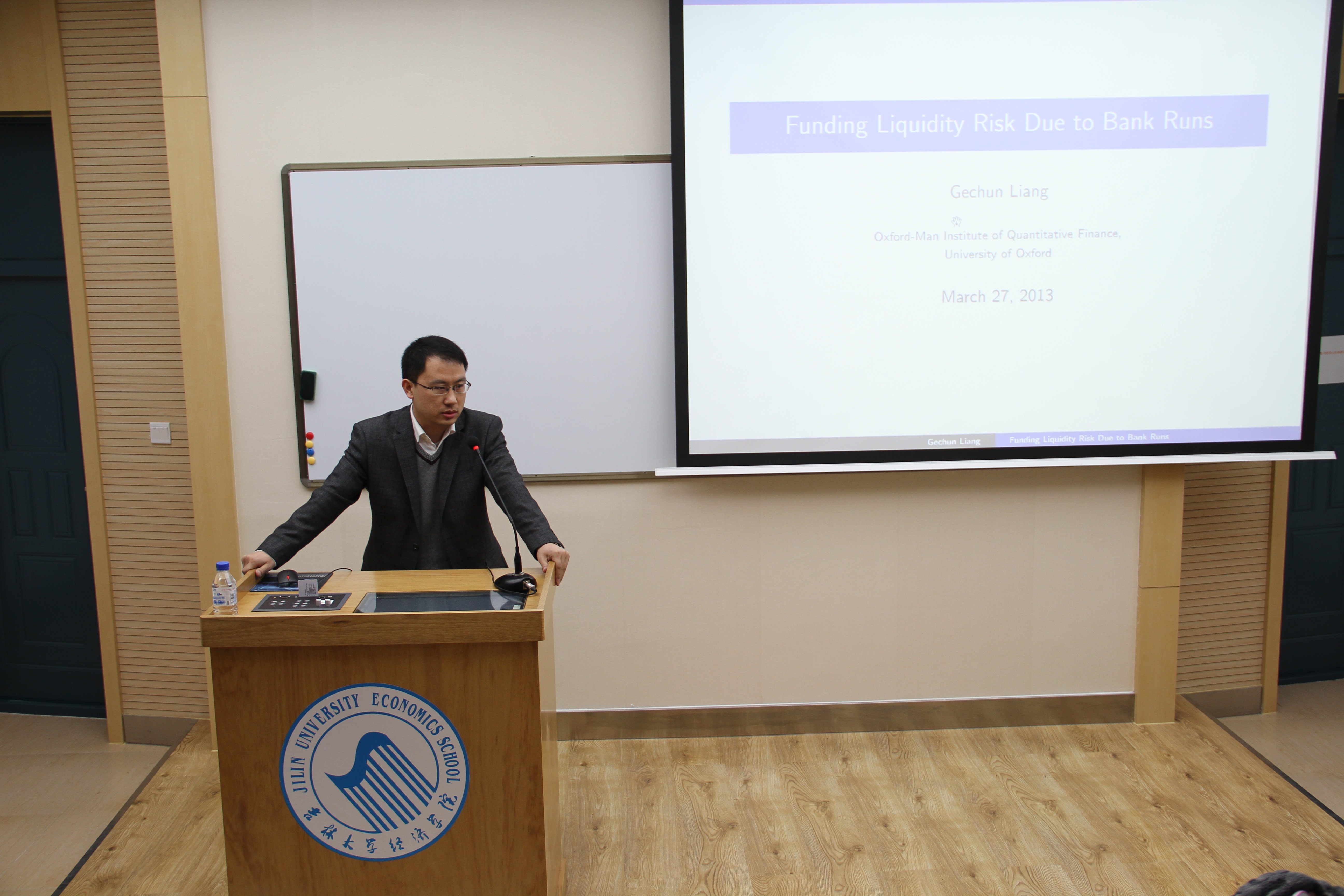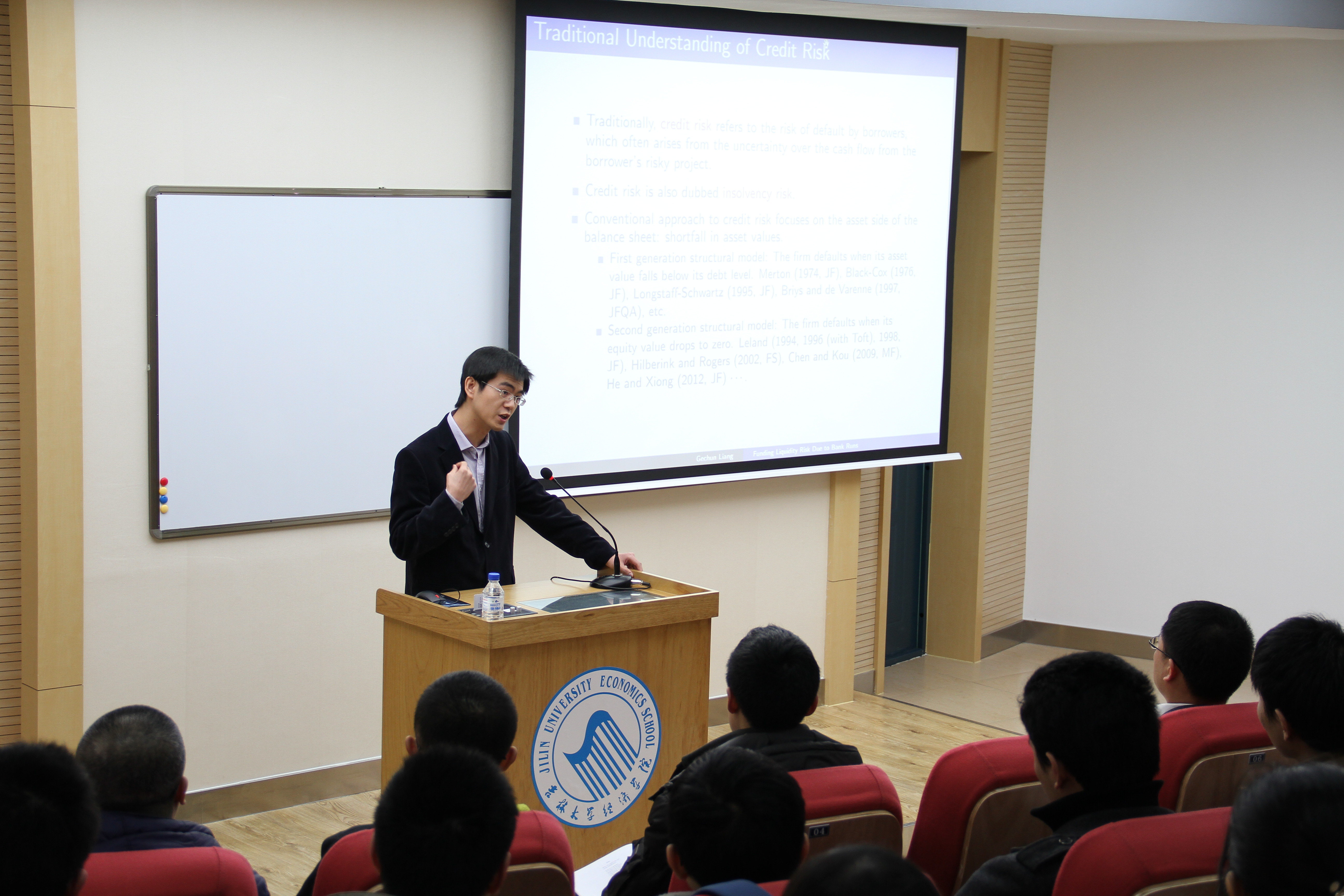 在报告开始前,史本叶副院长首先简要介绍了梁歌春博士的个人经历和学术研究情况,并对梁歌春博士回母校做学术报告表示热烈欢迎。随后,梁歌春博士以“Funding Liquidity Risk due to Bank Runs”为题,在进行充分文献评述的基础上,提出了一个可以包括流动性风险(展期风险)在内的结构化信用风险模型,并得到一个公司贷款人何时从公司撤出资金的阀值策略,从而分解公司信用风险为流动性风险和偿付风险。最后证明了这个阀值策略对应着一个非标准最优停时问题的解。报告结束后,同学们围绕模型变量选择、影响因素、计算工具以及行为金融学、数量金融发展前沿等问题积极提问,梁歌春博士认真回答了同学们提出的各个问题并与同学们进行了深入交流。
