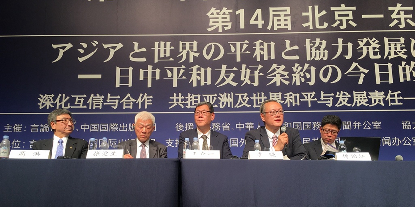 10月14-15日,主题为“深化中日互信、共担亚洲及世界和平与发展责任——思考中日和平友好条约的现实意义”的第十四届“北京-东京论坛”在日本东京举办。中共中央宣传部副部长、国务院新闻办公室主任徐麟,国务院新闻办公室原主任赵启正,中共中央对外联络部原副部长刘洪才,中国驻日本国特命全权大使程永华,中国国际交流中心副理事长、商务部原副部长魏建国,中央外办原副主任、空军原副司令员陈小工,中国外文局副局长方正辉,中国军事科学院高级智库学术委员会委员、中美防务关系研究中心主任姚云竹,中国军控协会理事、国防大学战略研究部原主任朱成虎,中国石油化工集团原董事长傅成玉,中国经济体制改革研究会副会长樊纲,以及日本国前内阁总理大臣福田康夫,联合国前副秘书长明石康,日本内阁官房副长官西村康稔,前外务大臣川口顺子,前防务大臣中谷元,前日本国驻中国大使宫本熊二,现众议院议员石破茂,日兴研究中心理事长,日本银行前副行长山口广秀,大和总研理事长、日本银行前副行长中曾宏,环日本海研究机构代表理事、亚洲开发银行研究中心前主任河合正弘等中日两国各界人士和400余名中日学者参加论坛。
