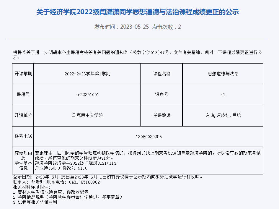 关于必赢线路检测30032022级闫潇潇同学思想道德与法治课程成绩更正的公示