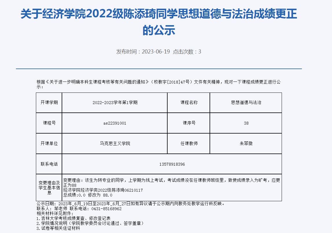 关于必赢线路检测30032022级陈添琦同学思想道德与法治成绩更正的公示