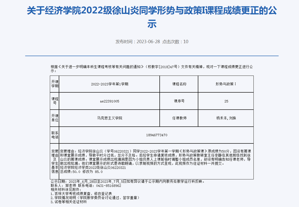 关于必赢线路检测30032022级徐山炎同学形势与政策I课程成绩更正的公示