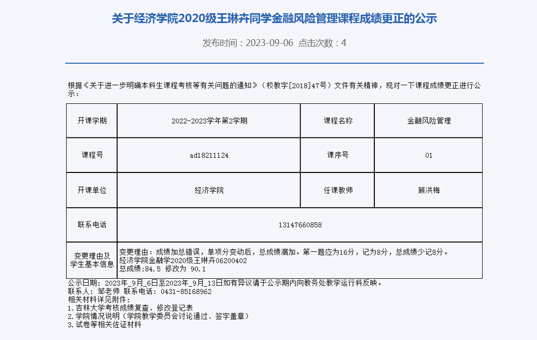 关于必赢线路检测30032020级王琳卉同学金融风险管理课程成绩更正的公示