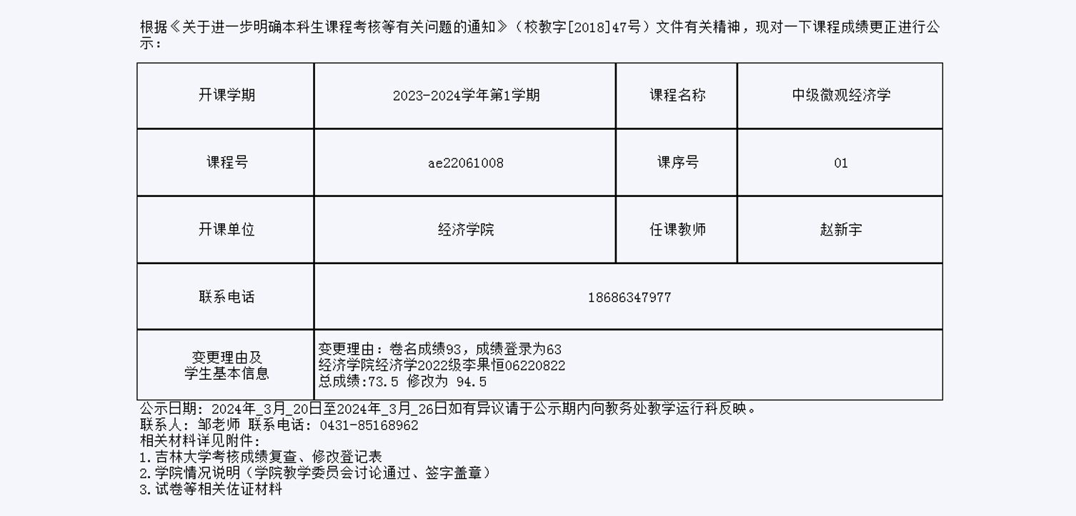 关于必赢线路检测30032022级李果恒同学中级微观经济学课程成绩更正的公示