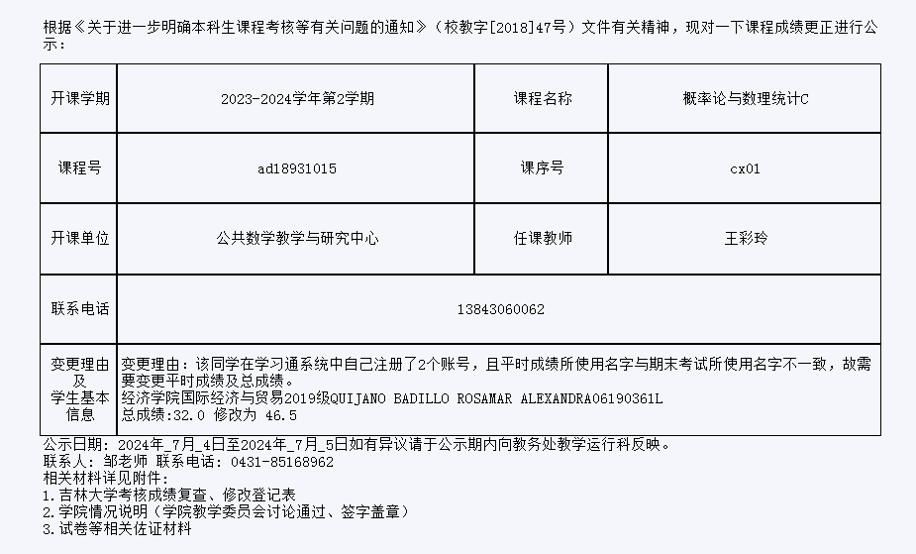 关于必赢线路检测30032019级QUIJANO BADILLO ROSAMAR ALEXANDRA同学概率论与数理统计C课程成绩更正的公示