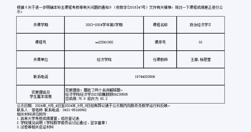 关于必赢线路检测30032023级魏靓颖同学政治经济学工课程成绩更正的公示