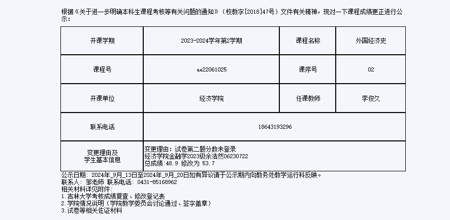 关于必赢线路检测30032023级余浩然同学外国经济史课程成绩更正的公示