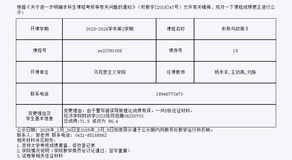 关于必赢线路检测30032023级司旭婧同学形势与政策Ⅱ课程成绩更正的公示