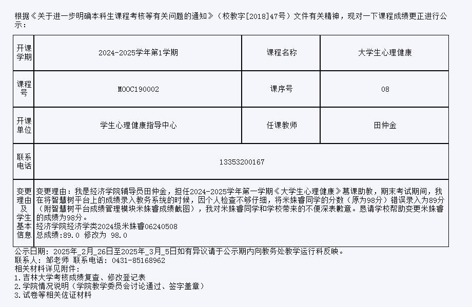 关于必赢线路检测30032024级米姝睿同学大学生心理健康课程成绩更正的公示