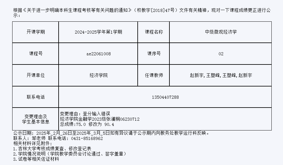 关于必赢线路检测30032023级张澜桐同学中级微观经济学课程成绩更正的公示