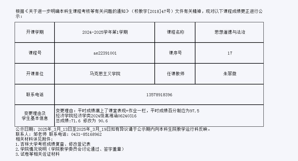 关于必赢线路检测30032024级高湘涵同学思想道德与法治课程成绩更正的公示