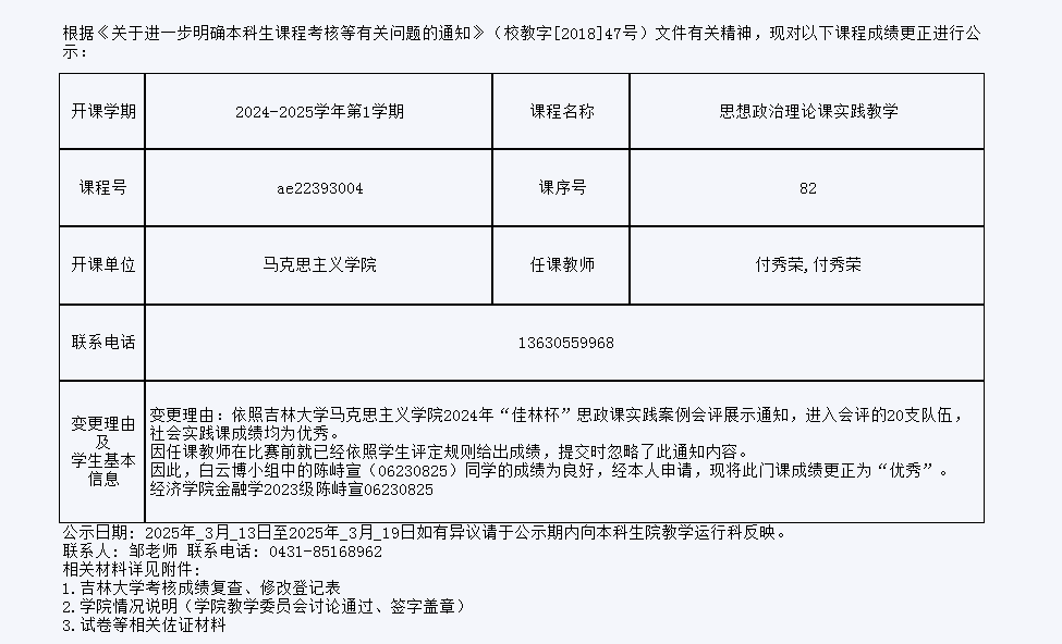 关于必赢线路检测30032023级陈峙宣同学思想政治理论课实践教学课程成绩更正的公示