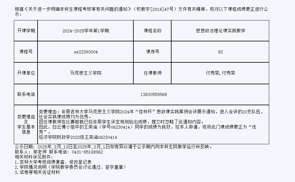 关于必赢线路检测30032023级王奕涵同学思想政治理论课实践教学课程成绩更正的公示