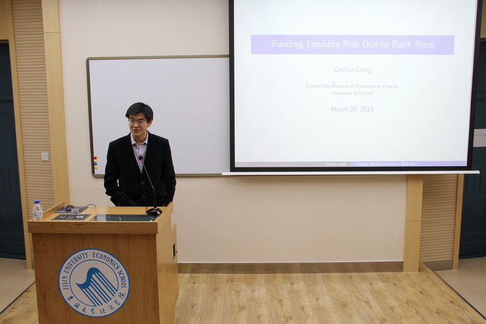 在报告开始前,史本叶副院长首先简要介绍了梁歌春博士的个人经历和学术研究情况,并对梁歌春博士回母校做学术报告表示热烈欢迎。随后,梁歌春博士以“Funding Liquidity Risk due to Bank Runs”为题,在进行充分文献评述的基础上,提出了一个可以包括流动性风险(展期风险)在内的结构化信用风险模型,并得到一个公司贷款人何时从公司撤出资金的阀值策略,从而分解公司信用风险为流动性风险和偿付风险。最后证明了这个阀值策略对应着一个非标准最优停时问题的解。报告结束后,同学们围绕模型变量选择、影响因素、计算工具以及行为金融学、数量金融发展前沿等问题积极提问,梁歌春博士认真回答了同学们提出的各个问题并与同学们进行了深入交流。