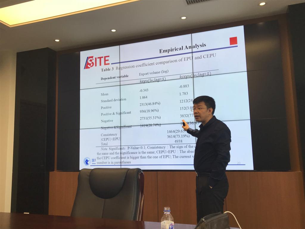 李兵副教授首先介绍了该领域前人研究存在的局限,他认为研究加入WTO带来的经济政策不确定性下降对当下的时代背景来说研究意义较小,此外,Baker et al. (2016) 提出的中国经济政策不确定性衡量指标仅仅能刻画经济政策不确定性的长期影响,并且存在衡量偏误的问题。因此,李兵副教授对该指标进行了修正,基于中国三大主流权威报纸构建了衡量经济政策不确定性的月度指标。接着,李兵副教授对模型的设定和实证结果进行了阐释,发现经济政策不确定性总体上会显著抑制出口。进一步地,为放松所有产品具有相同的时间趋势和季节的前提假定,李兵副教授对模型进行了修正,系数的核密度曲线分布显示结论依然成立,但发现经济政策的不确定性对出口的影响存在产品异质性。为探索其背后的原因,他在Lagos & Wright (2005)研究的基础上构建了基于议价能力的局部均衡和一般均衡搜寻模型,并将产品按照经济属性、内部异质性、进口需求弹性、全球出口企业数目及融资约束异质性特征分别进行回归。最后,通过调整衡量指标等方式对模型进行一系列的稳健性检验,回归结果依然成立。通过以上分析,李兵副教授指出,如果所有贸易对经济政策不确定性的反应均产生扭曲,那么经济政策不确定性将带来更大的福利损失。