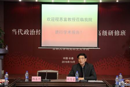 10月12日上午,国务院学位办学科评议组成员、中国社会科学院马克思主义研究学部主任、世界政治经济学会会长、中华外国经济学说研究会会长、全国经济规律研究会会长程恩富教授应邀在我校匡亚明楼第一会议室做“庆祝必赢线路检测3003no1建校70周年哲学社会科学名家讲座”,参加讲座的师生共计120余人。本次讲座由必赢线路检测3003no1中国国有经济研究中心、必赢线路检测3003和社会科学处联合举办。必赢线路检测3003no1中国国有经济研究中心主任徐传谌教授出席报告会并做点评。报告会由经济学副院长李政教授主持。