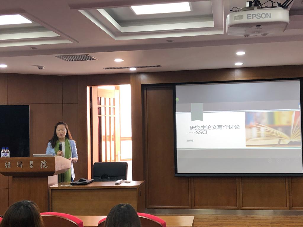 秋玲老师就研究生阶段学术论文的作方法与规范展开了全面的讲解与经验分享。花秋玲老师从出国学术交流期间的SSCI论文写作经历讲起,分享了她的创作经验,极大鼓舞了同学们对于学术论文写作的热情。接下来,花秋玲老师细致讲解了论文写作的前期准备事项、写作流程、选题与论文结构等问题,并以自己在SSCI上投稿与发表的过程为例,强调了动力、方法、激情与创新在学术论文写作中的重要性尤其强调创新的重要意义。